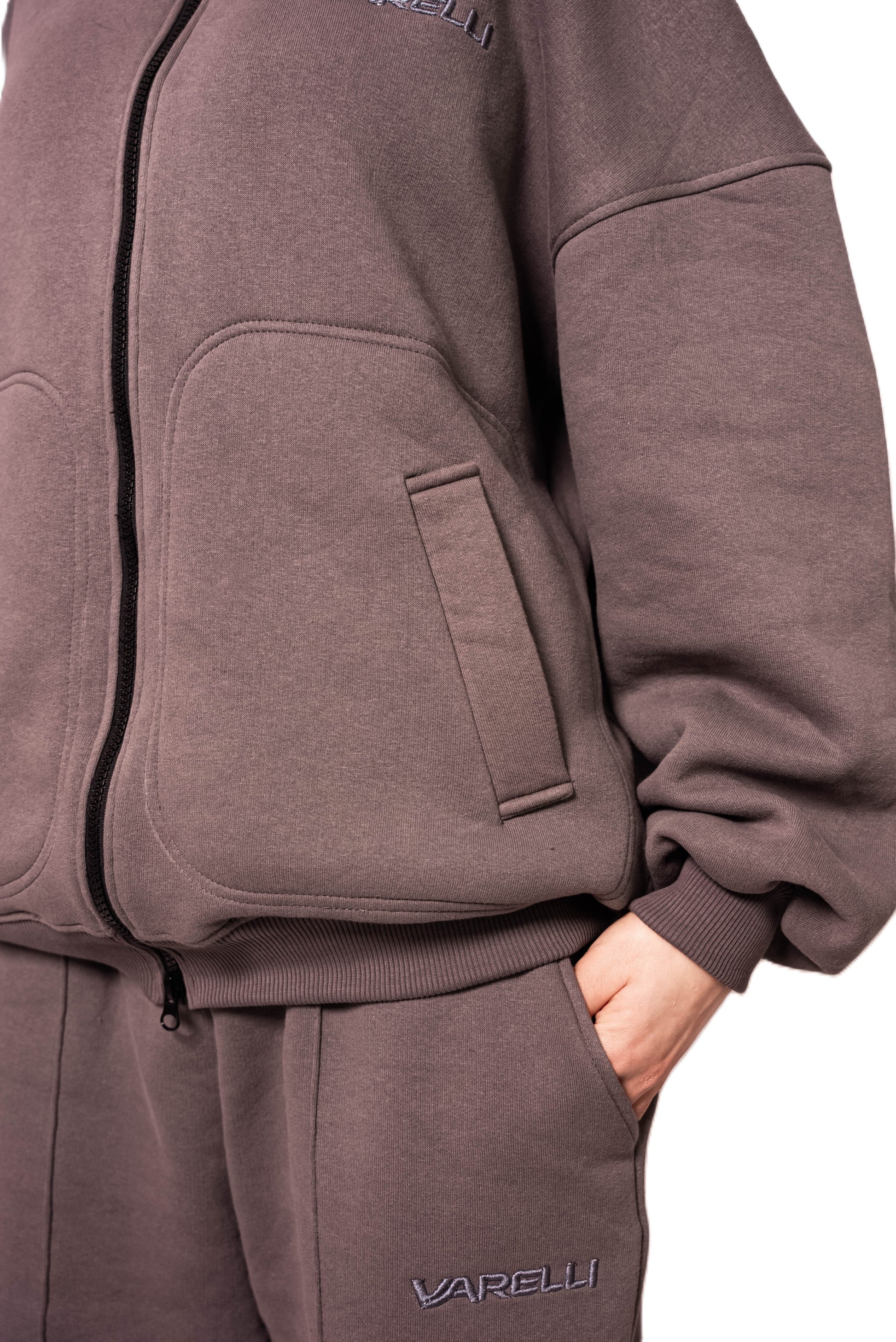 Réalisé en coton molletonné gratté, cet ensemble offre une sensation de douceur enveloppante et une coupe fluide qui valorise la silhouette. La veste zippée et le pantalon assorti forment une harmonie parfaite entre confort et style.